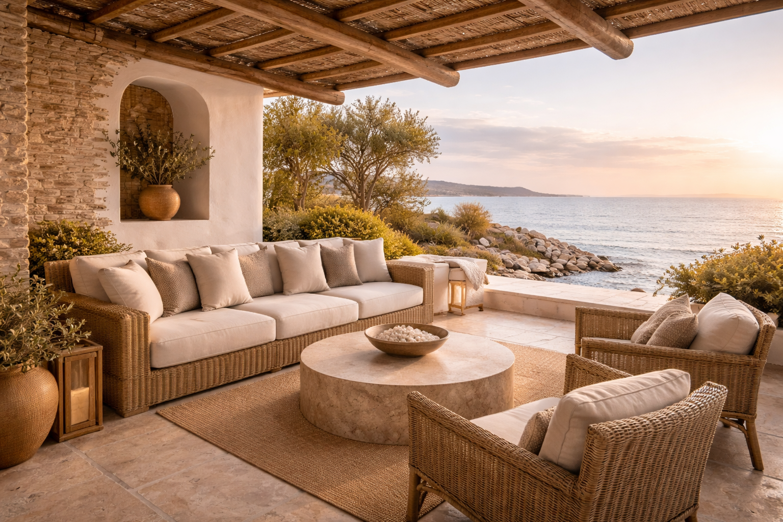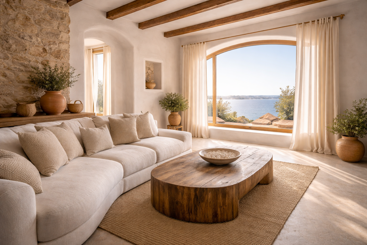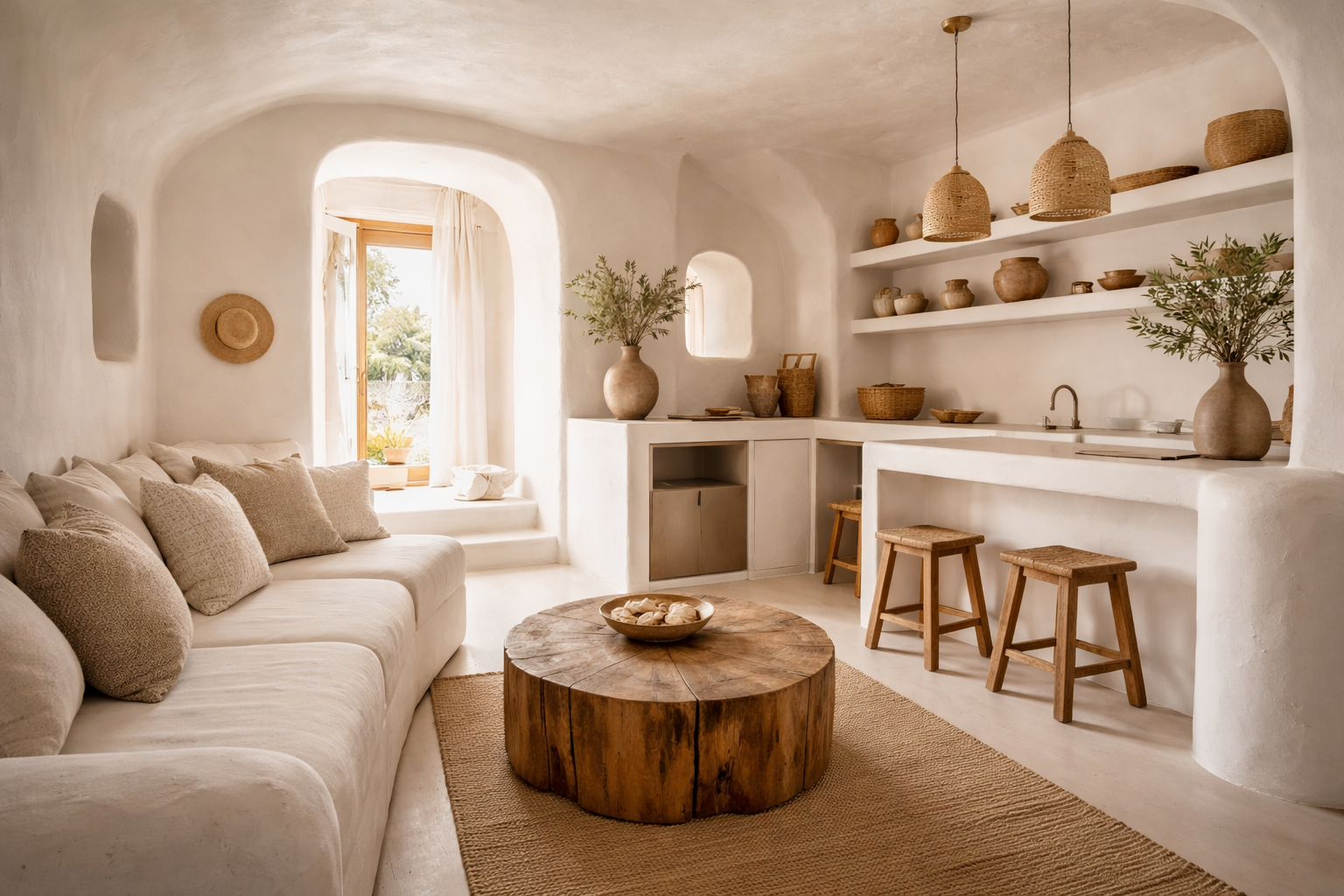 Τα υλικά δεν επιλέγονται για να δηλώσουν πολυτέλεια, αλλά για να γεννήσουν αίσθηση. Πέτρα, ασβέστης, ξύλο — υλικά ανθεκτικά, που φθείρονται όμορφα με τον χρόνο, που "αναπνέουν" μαζί με τον χώρο. Η υφή τους δεν κρύβεται, αναδεικνύεται μέσα από το φως και δίνει βάθος στην καθημερινή εμπειρία.
